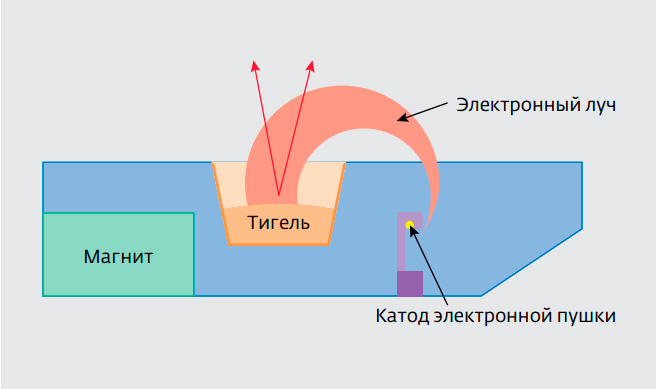 Как правило, электронно-лучевой испаритель состоит из трех основных частей: электронной пушки, отклоняющей системы и водоохлаждаемого тигля различной емкости. Это обеспечивает непрерывную работу без добавления испаряемого материала, который, кроме того, в расплавленном состоянии не контактирует с медными стенками тигля.