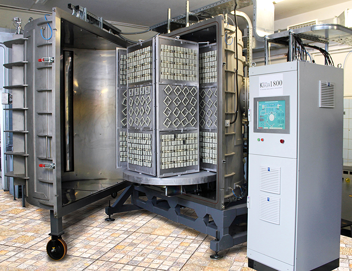 Наша камера оснащена планетарным держателем подложек и уникальной системой напыления сбоку. Протяженные магнетроны, вакуумно-дуговые испарители и ионные источники, входящие в состав установки 1800, гарантируют высокое качество и равномерность покрытия.